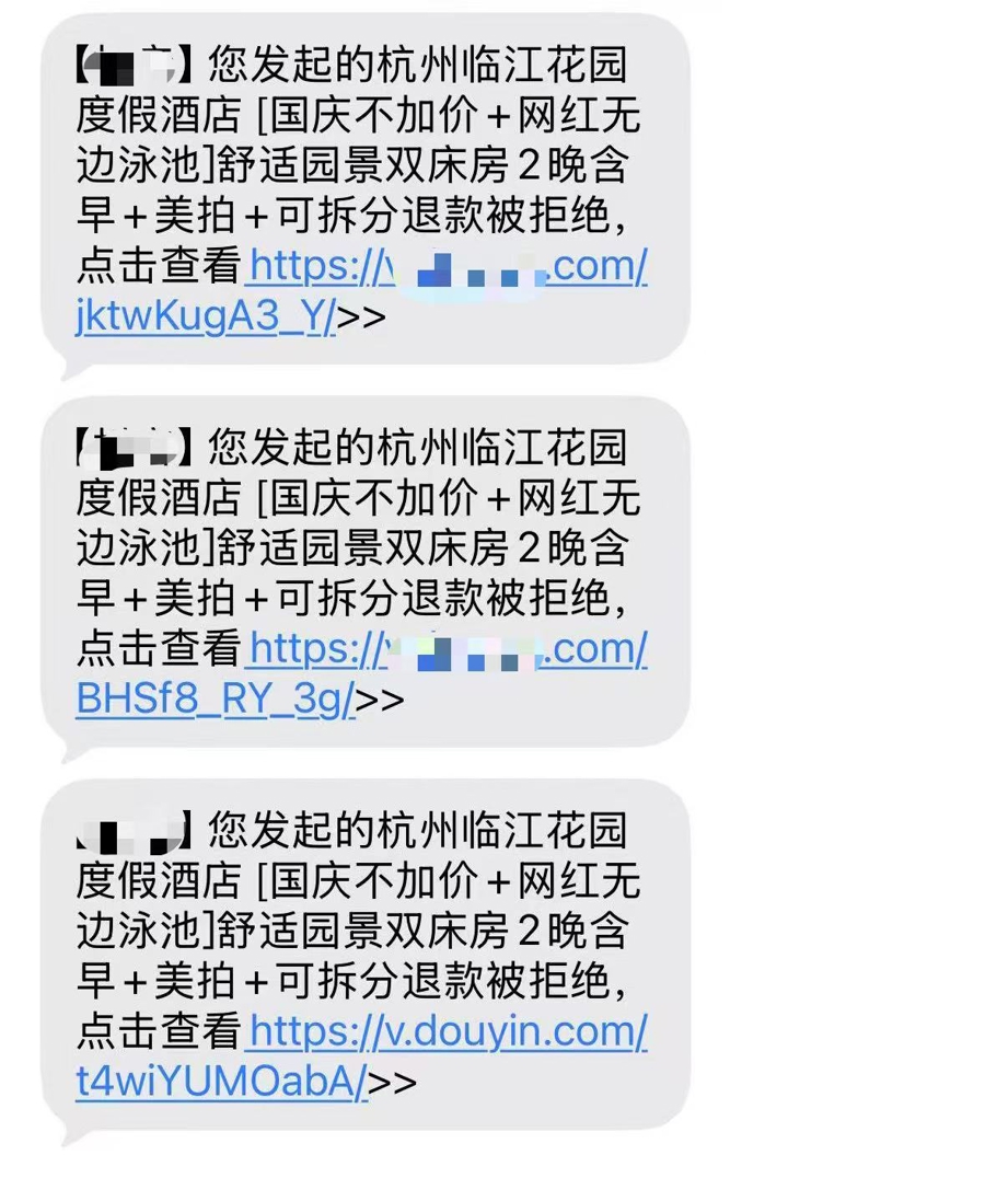 今年8月11日,市民谢女士在某短视频平台的团购频道内下单,预订了“杭州临江花园度假酒店舒适园景双床房2晚”。她一共下了4笔相同的订单,即4间房间,实付498.98元,预约入住时间为10月2日至10月4日。“由于这4笔订单是需要逐一预约的,所以我第一时间联系酒店。当时,酒店方面表示,房型不足4间,需在国庆期间到店后再安排。至于价格方面,到场后,每间房加价150元,即可办理入住。”谢女士对此表示认可。为不耽误预定的出游计划,她持续与该酒店保持联系。“每隔两个礼拜,我都会给酒店打电话,确认订单及金额。对方一直表示没问题,届时去办理入住即可。”