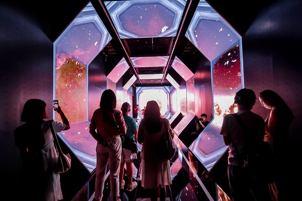为让收官阶段的观展体验更丰富,展览特别推出两大亮点:10月1日至8日,专业舞者将每日不间断驻场表演,以“传统+现代”融合的舞蹈语言,为烛龙神话注入肢体叙事——当观众“乘坐时空飞船”从宏观世界穿越至烛龙微观世界时,在“龙息”“搅动星空”“神经元”等空间的衔接处,舞者将用流畅动作诠释“光照”“时空”“生命”等神话意象,让抽象的神话概念变得具象可感。这种跨媒介表达,既增强了公众对上古神话的亲近感,也让展览成为兼具美育功能的公共文化空间。
