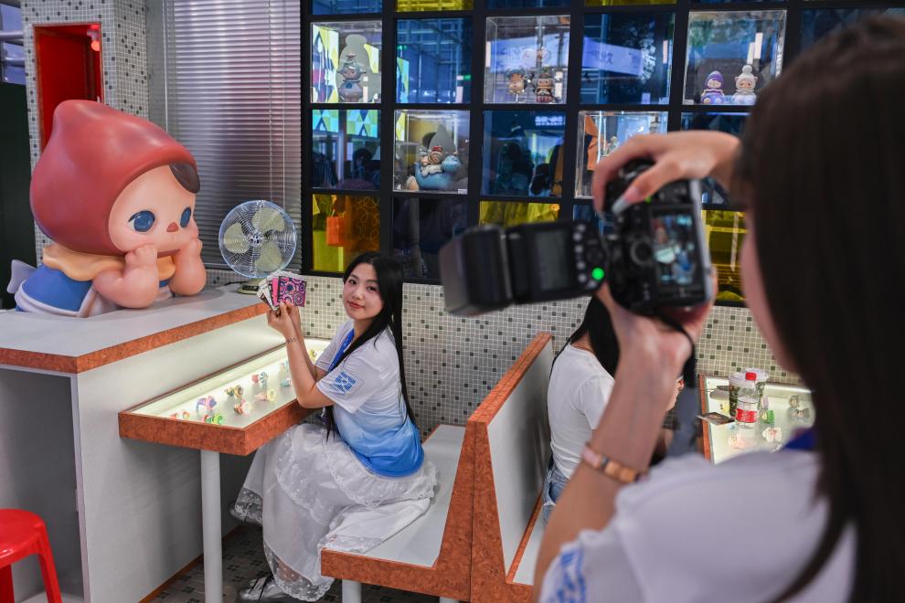 5月22日涌融优配,观众在文博会香港展区泡泡玛特主题港式茶餐厅打卡拍照。新华社记者肖恩楠摄